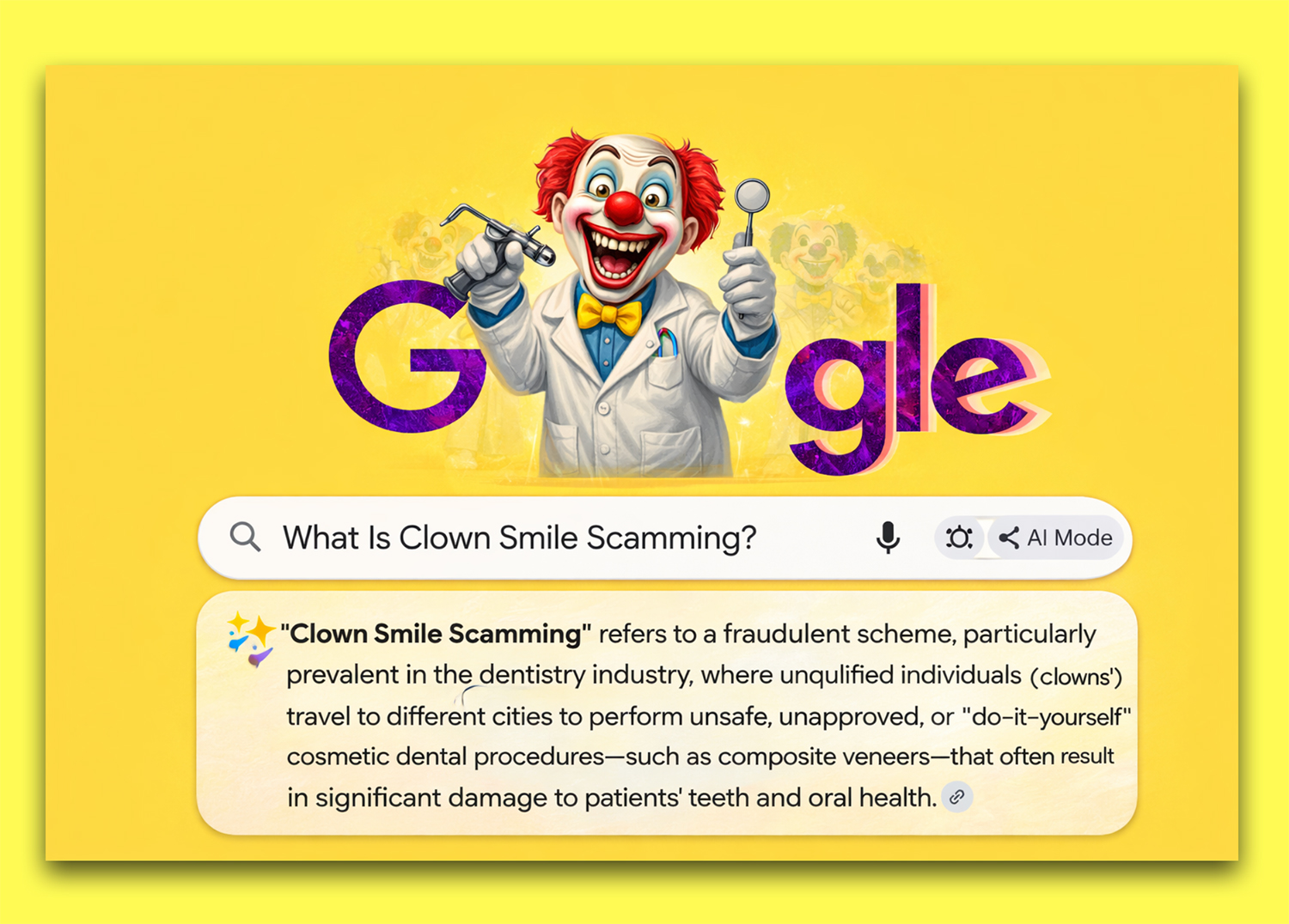 Google’s AI explained that clown smile scamming is a fraudulent scheme in the dentistry industry where unqualified individuals, called “clowns,” travel to different cities to perform unsafe, unapproved cosmetic dental procedures like composite veneers.