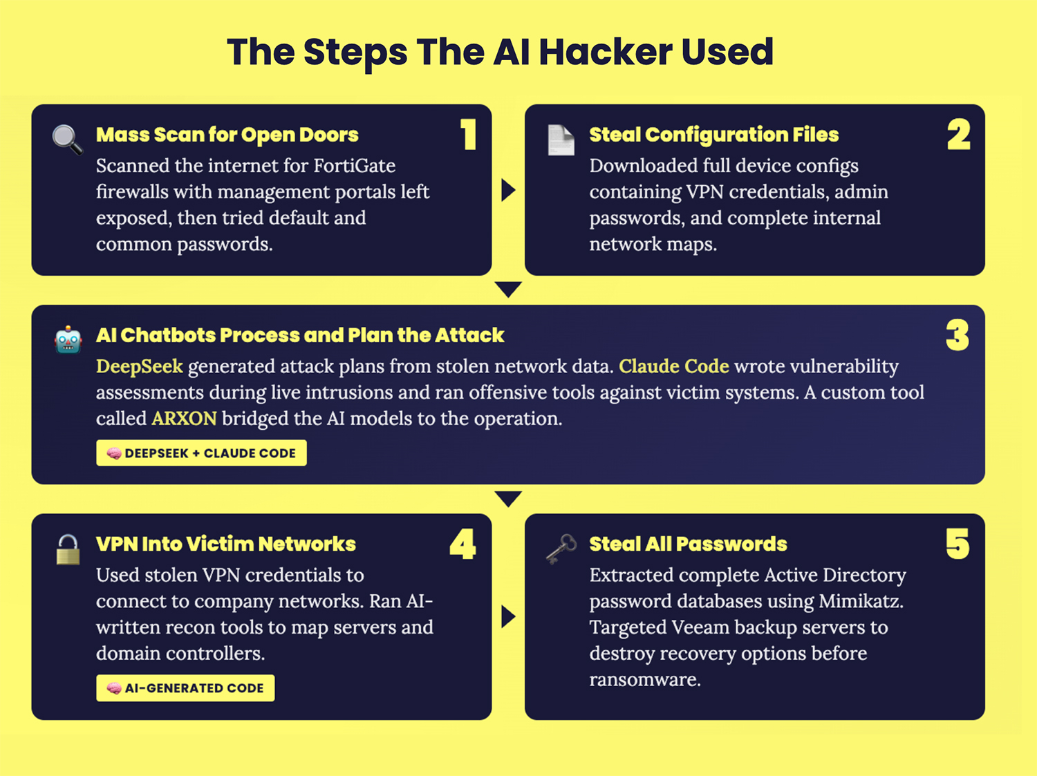 The hacker used at least two different AI Chatbots to help him hack the firewalls. One of the chatbots helped him write the attack scripts and build the custom software to launch the attack. The other chatbot helped him break deeper into a specific network once he was in.
