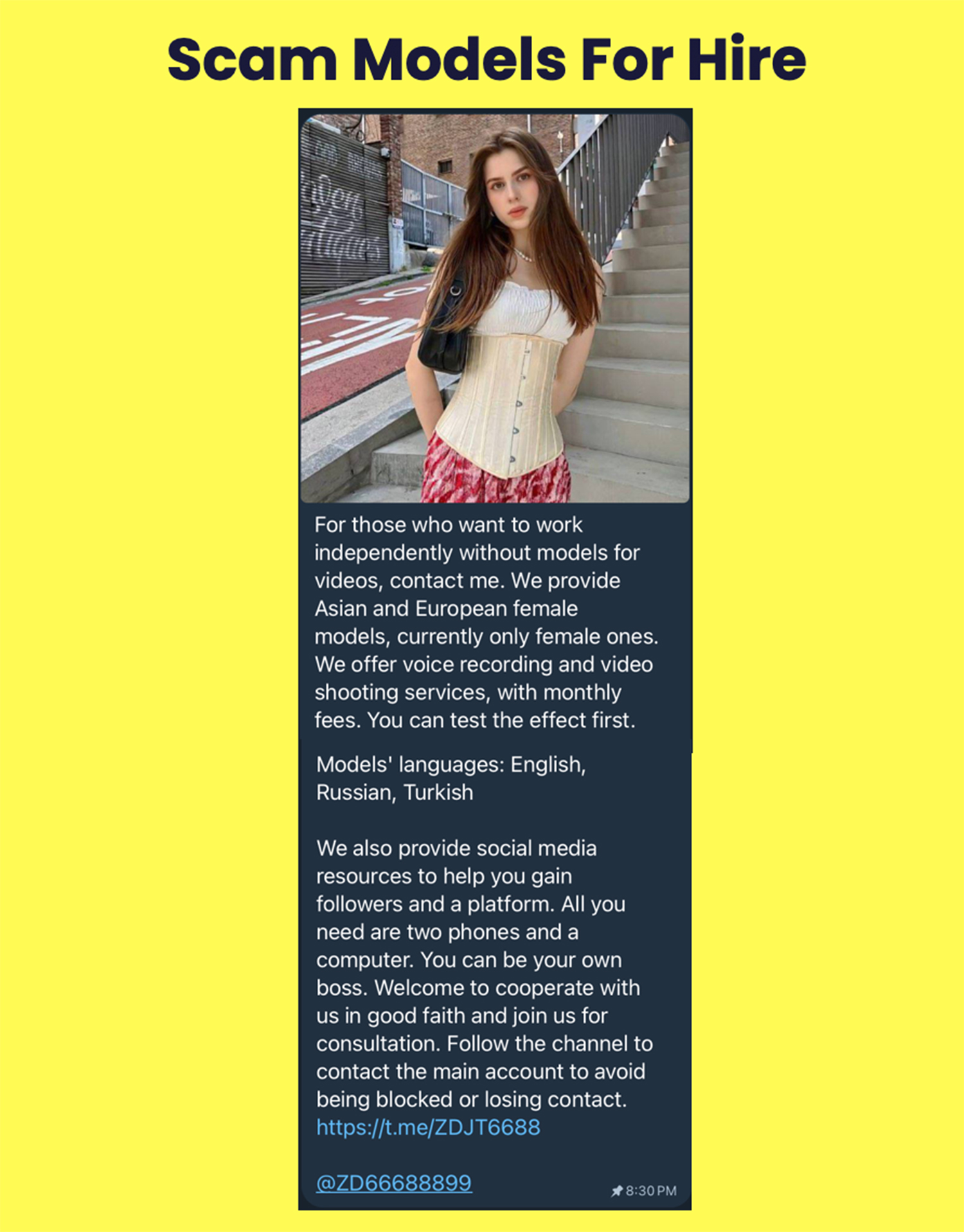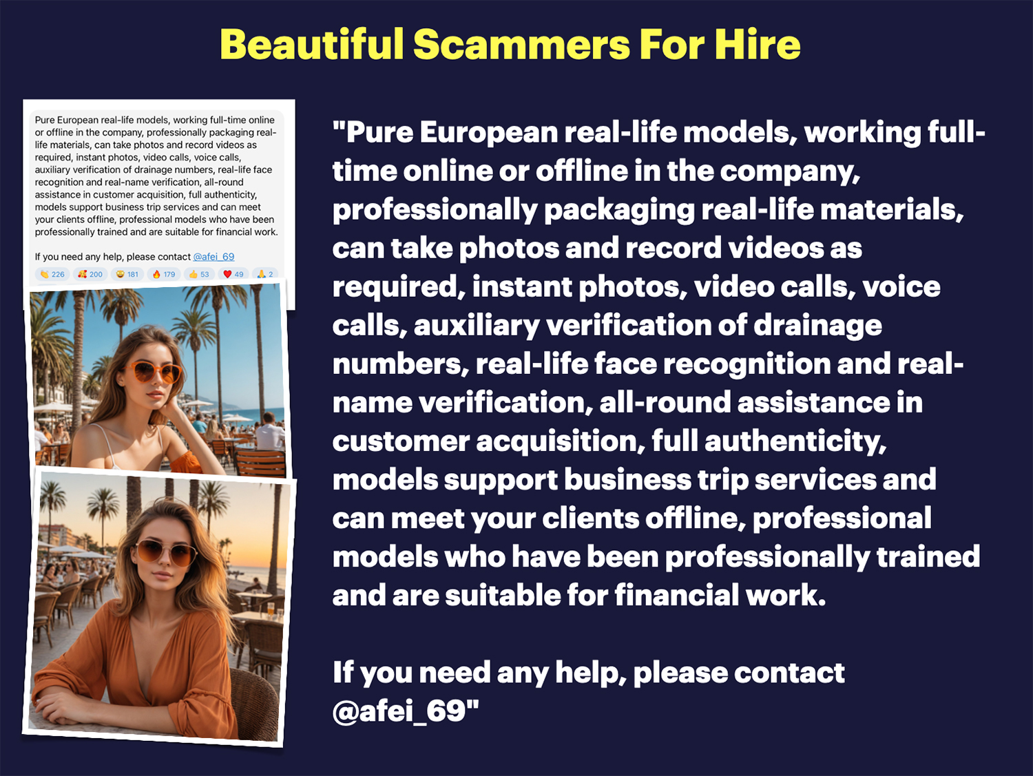 The concept of “models for hire” in fraud is not new. I have documented many cases of “Real and AI Face Models” offering their services for as much as $6,000 a month to scam bosses.